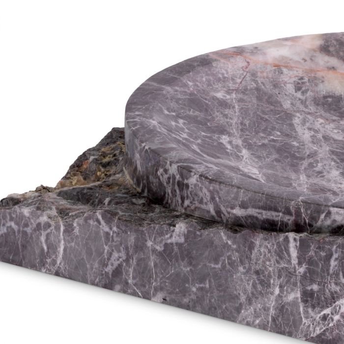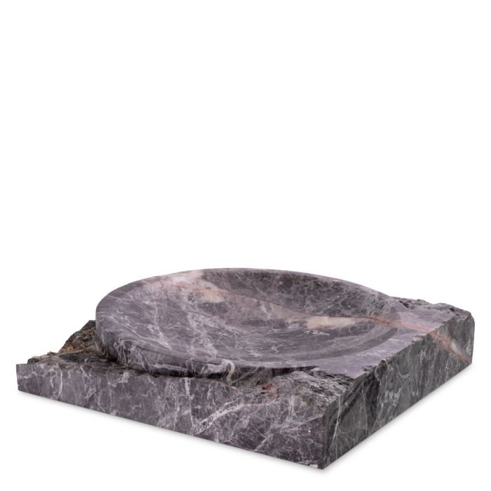 Dit stuk grijs marmer heeft een vierkante vorm en wordt gekenmerkt door ruwe zijkanten en een komvormig gepolijste binnenkant.