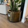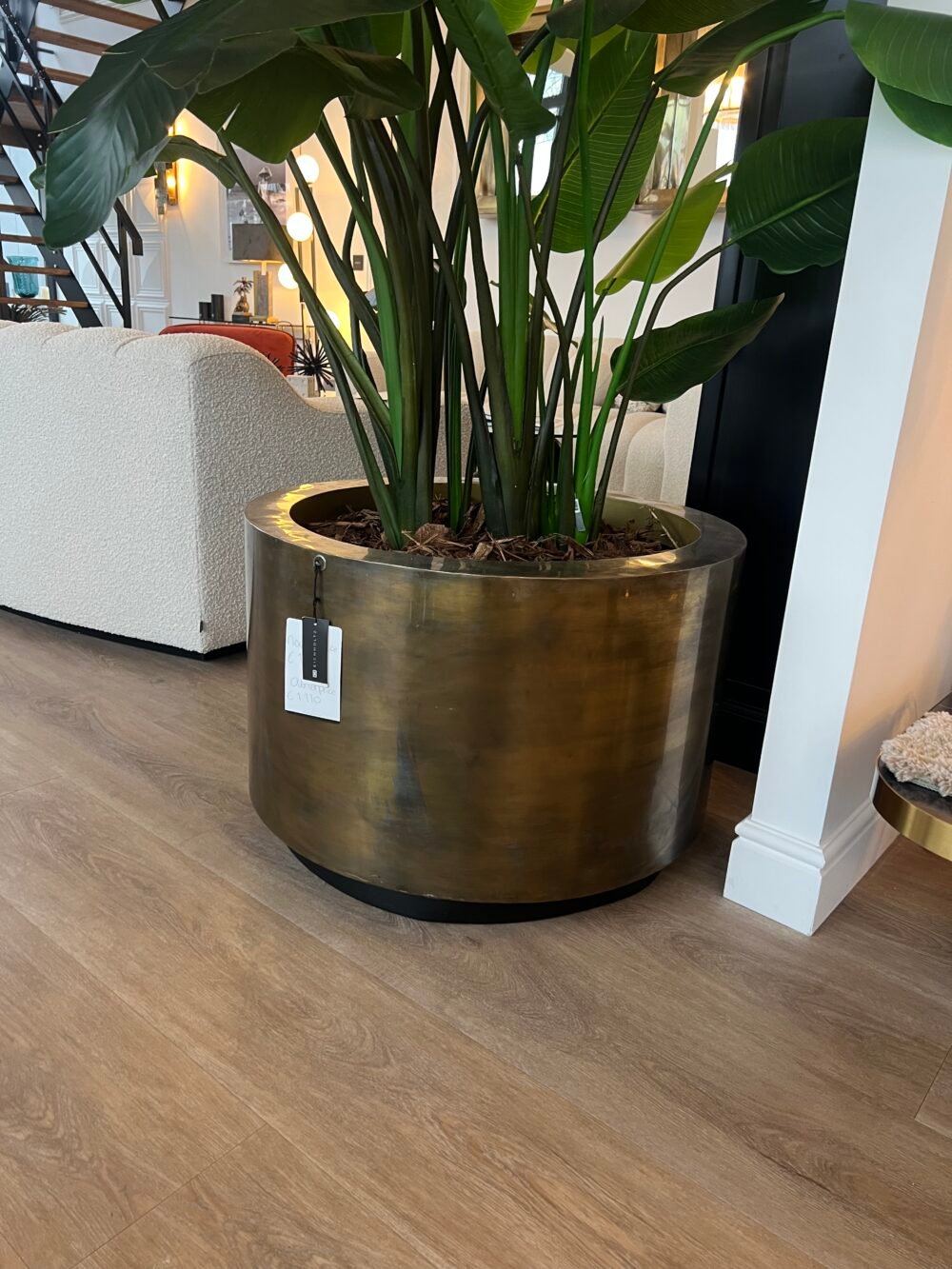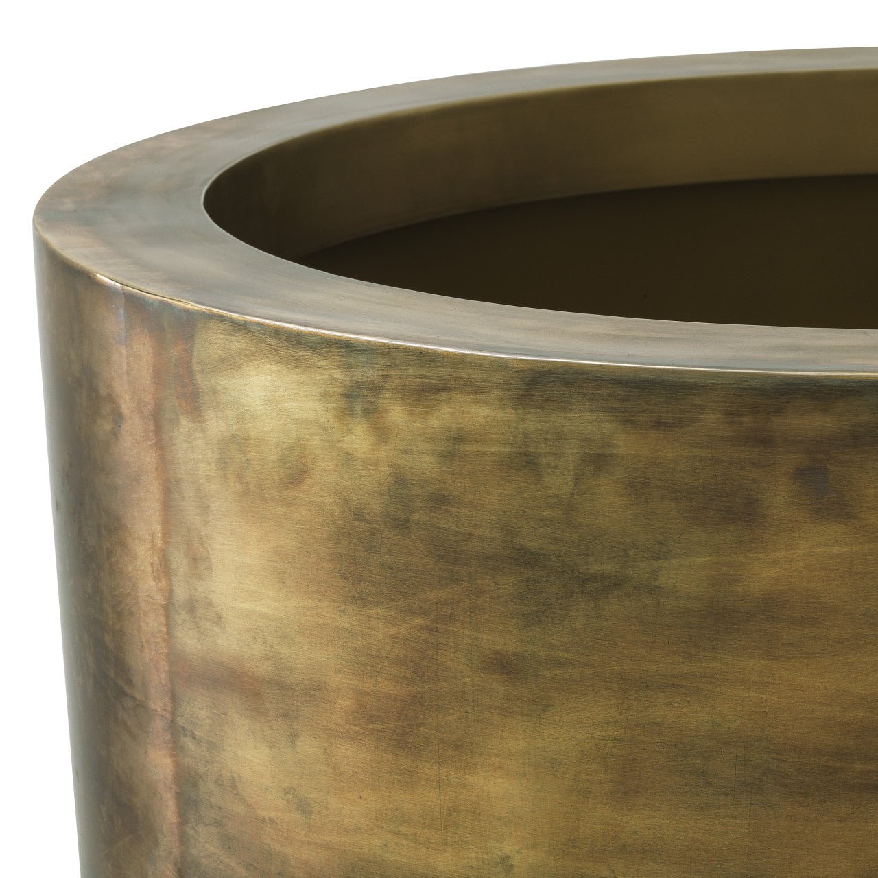 De grote Jasper plantenbak valt op door zijn gladde oppervlak met licht reflecterende look en fascinerende kleurschakeringen. De vintage messing afwerking toont metallic goud dat overgaat in diepe bronzen en warme kopertinten. Omdat het een handgemaakt product is, zijn er kleine verschillen, waardoor elk item uniek is. Alleen voor gebruik binnenshuis.