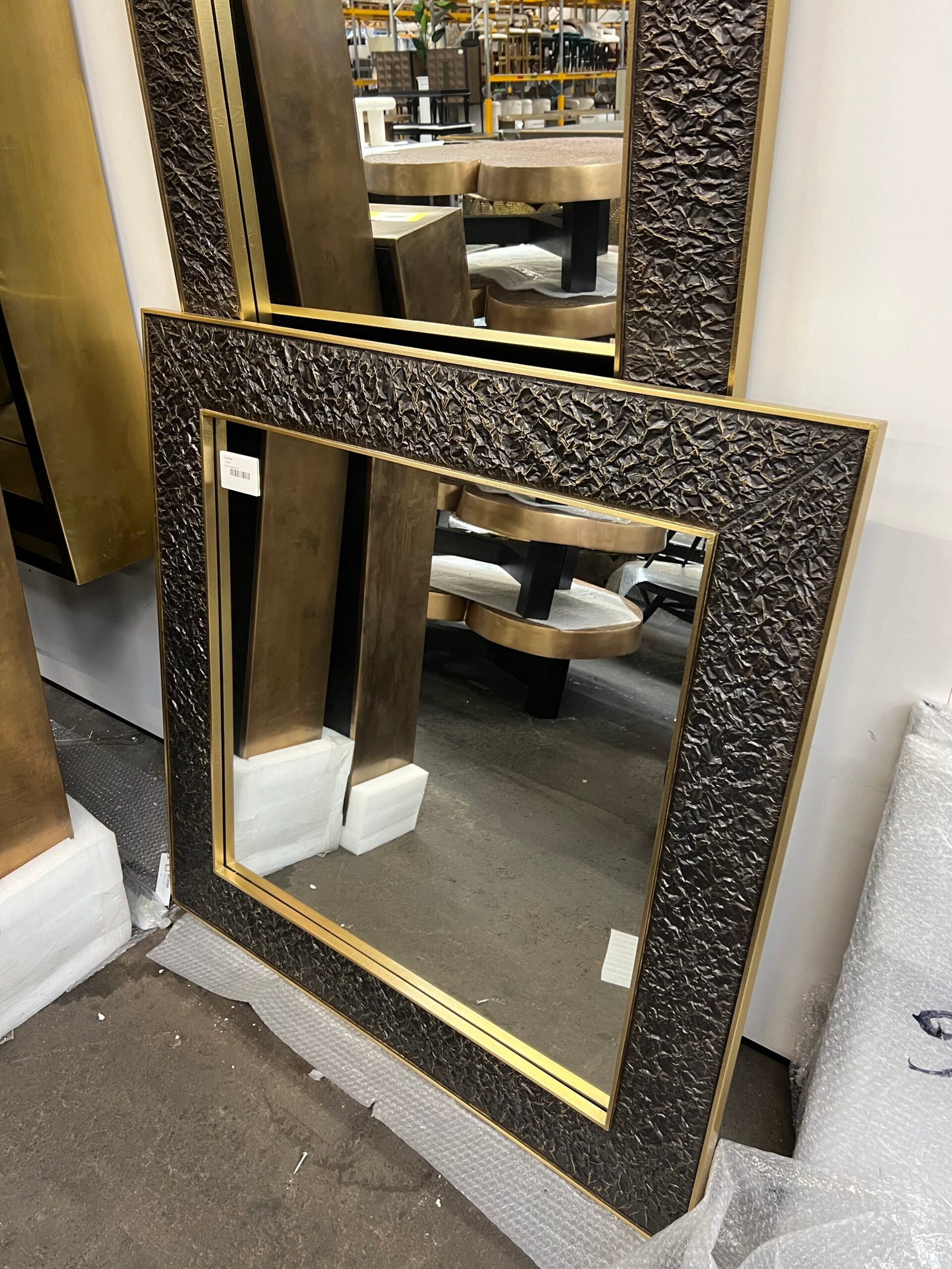 De vierkante Risto spiegel is een fascinerend object dat zowel stijl als textuur omarmt. Het frame heeft een opmerkelijk reliëf dat diepte en visueel belang toevoegt aan het ontwerp. De rand in antiek messing creëert een veelzijdig accent dat past bij verschillende interieurthema’s.