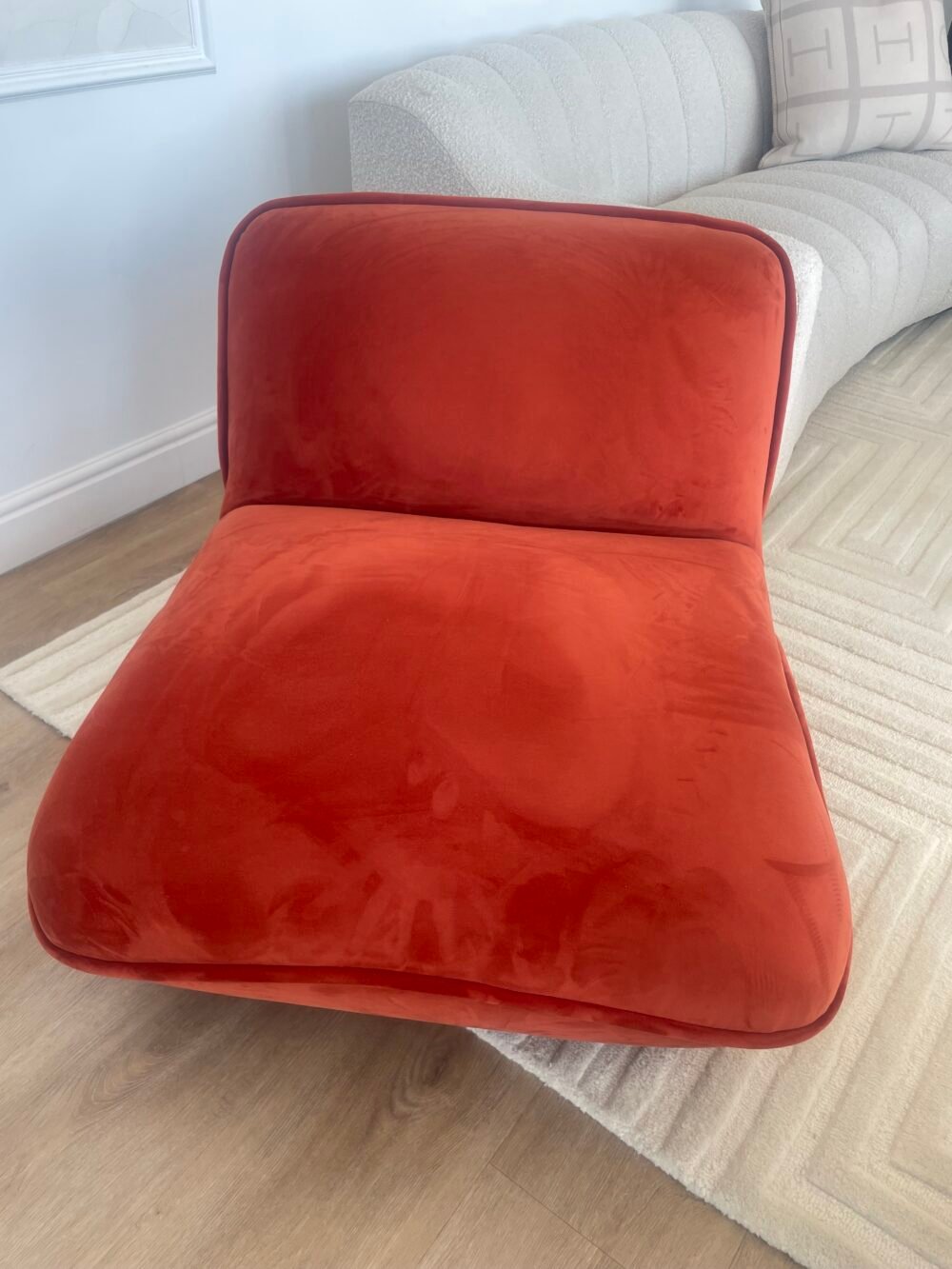 Zoals de naam al doet vermoeden, biedt Chair Relax de perfecte omstandigheden voor ontspanning in de namiddag. Deze draaifauteuil, die eruitziet als twee kussens die haaks op elkaar staan, is niet alleen esthetisch aantrekkelijk maar ook zeer comfortabel. Met zijn Savona oranje fluwelen bekleding met biezen en een draaivoet van geborsteld messing zal deze accentstoel in elke woonkamer in het middelpunt van de belangstelling staan.